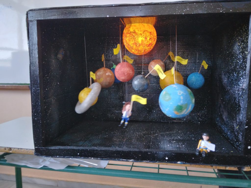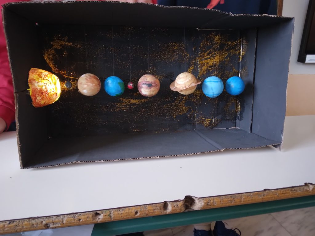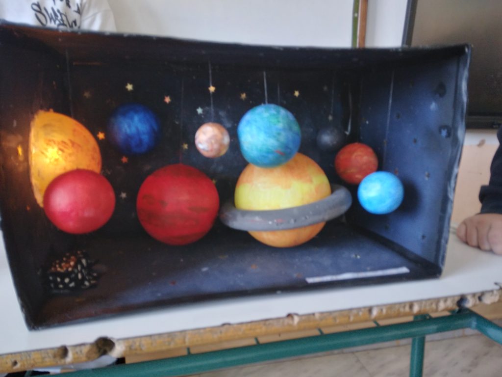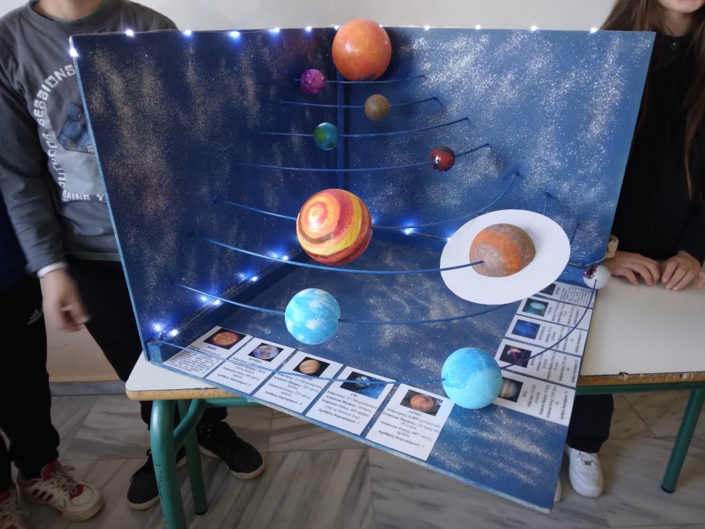 «Το τμήμα Ε΄1 και η εκπαιδευτικός του Ελισάβετ Γκίρδα, στο πλαίσιο του μαθήματος της Γλώσσας με θεματική το Διάστημα, ανέλαβαν και ολοκλήρωσαν ομαδικές εργασίες με αντικείμενο την αναπαράσταση του Ηλιακού Συστήματος.»